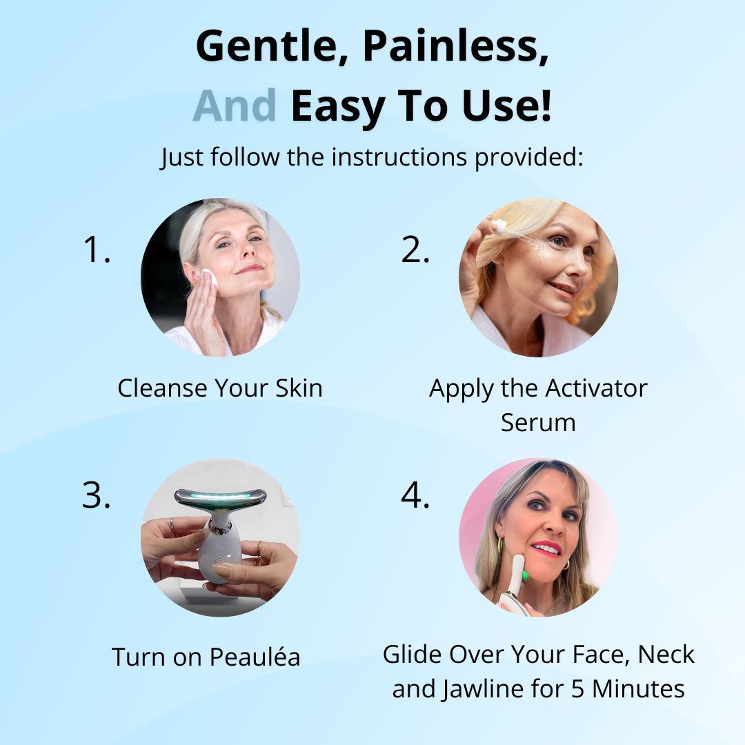 Select your desired light mode, then gently glide PEAULÉA LumiSculpt™ in upward strokes across your face, jawline, and neck. Just 5–10 minutes a day is all it takes to lift, contour, and revive tired-looking skin.